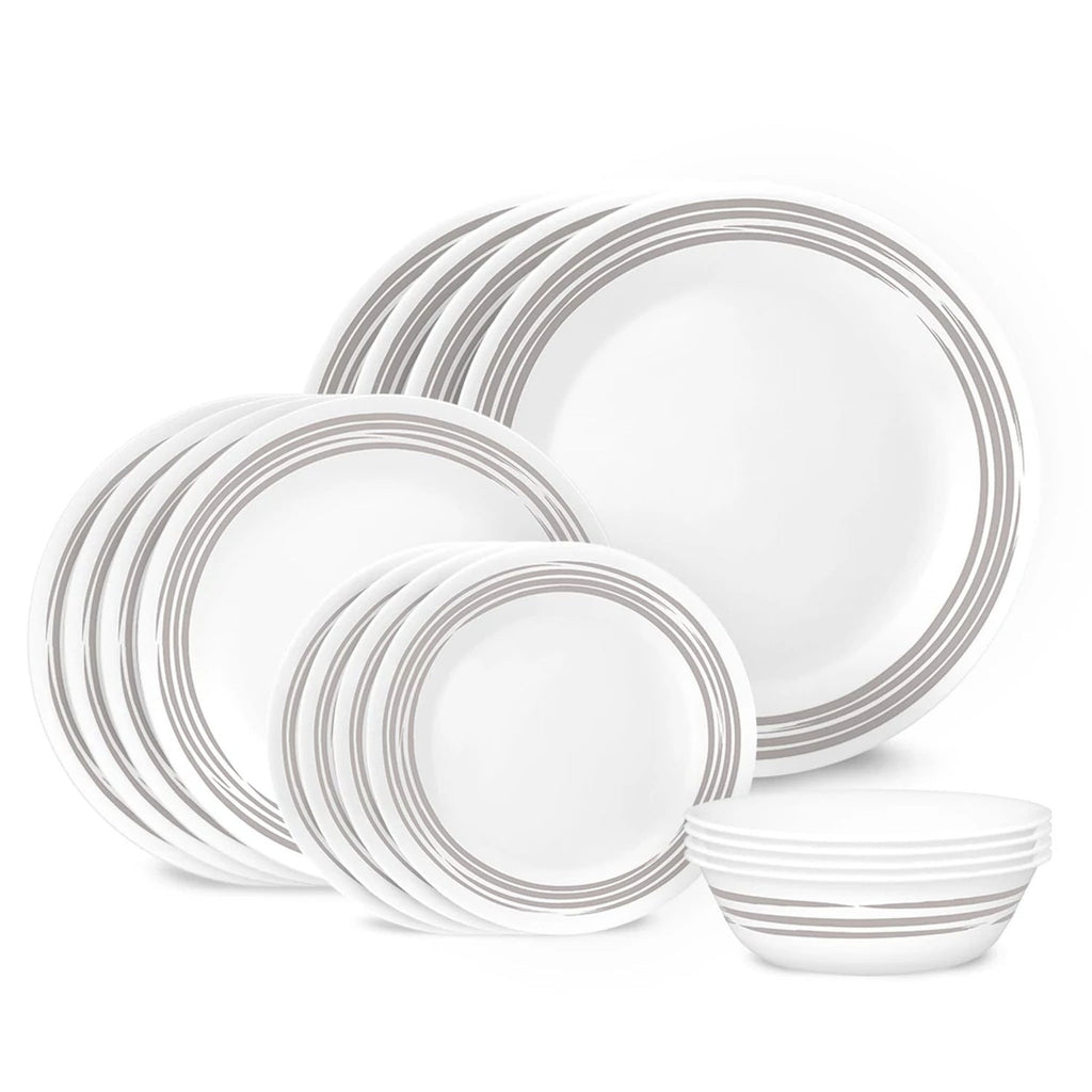 Silvery-grey brushstroke bands circle the rim of these bright white plates, for a distinctive dinnerware set. Casual enough for everyday meals with the family, it dresses-up beautifully for a special dinner with friends.