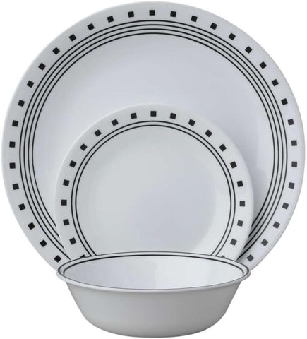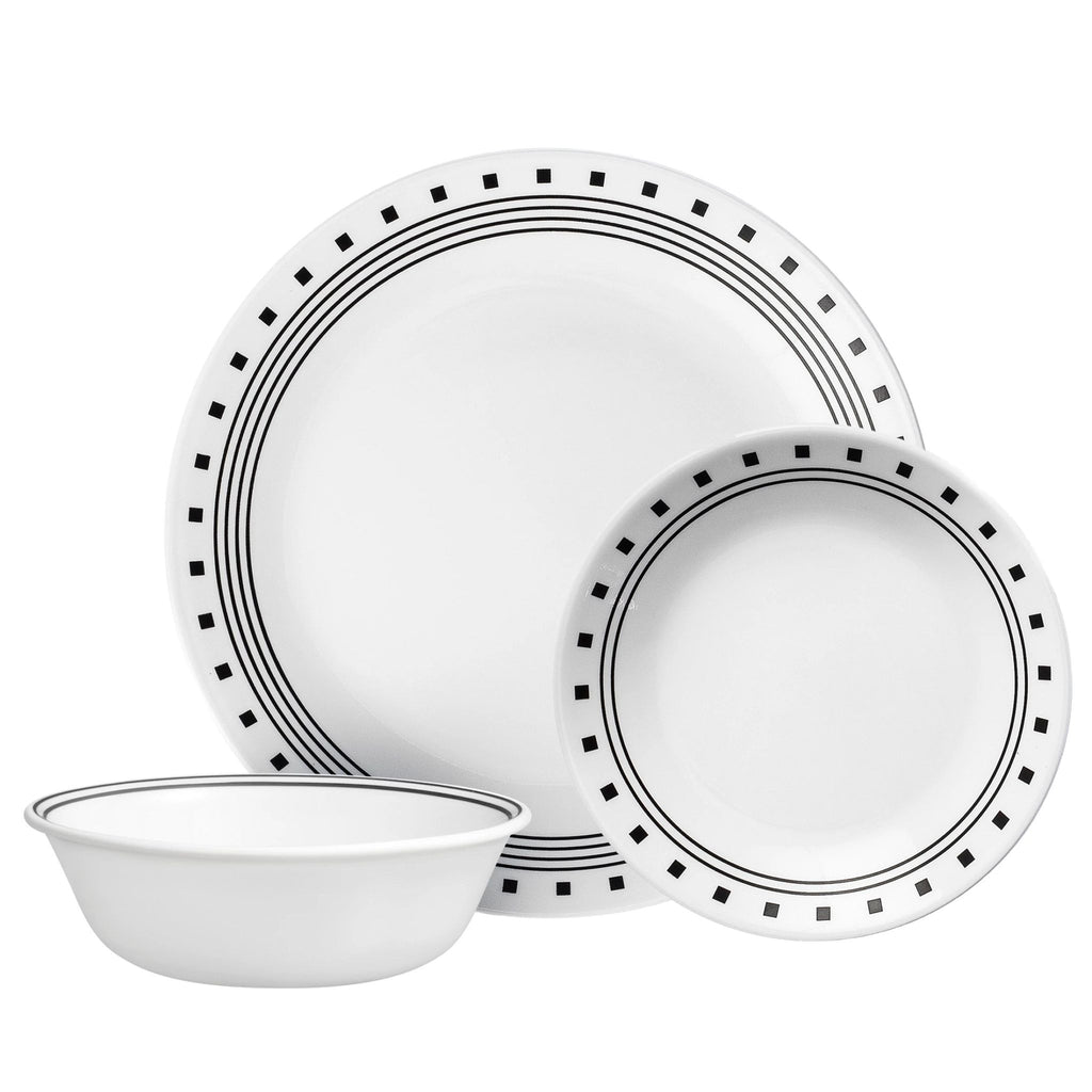 Bring graphic modern style to your table with the Corelle® City Block 12-piece Dinnerware Set. Featuring bold black bands and crisp geometric dots, this iconic pattern adds contemporary flair while staying timeless enough for everyday use.