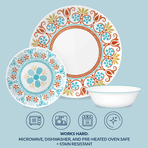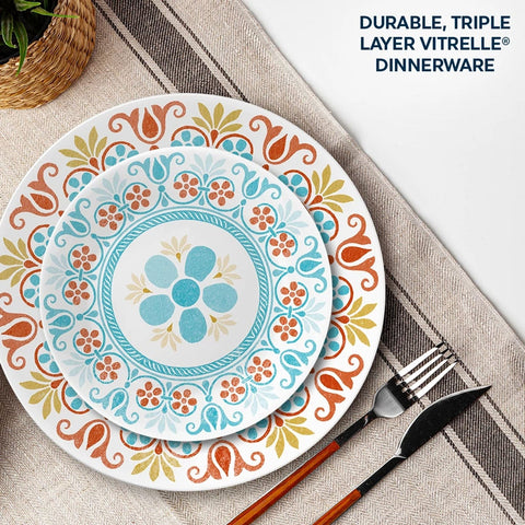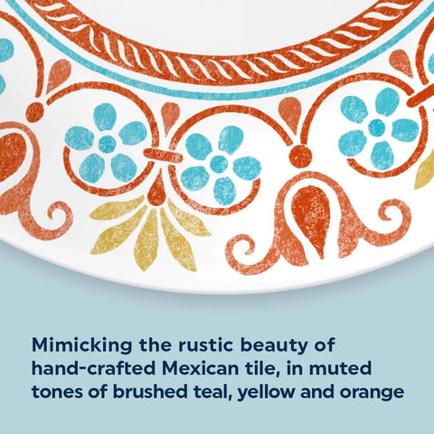 Mimicking the beauty of antique hand-crafted Mexican tile, Terracotta Dreams includes scrolls, florals and bands in muted tones of brushed teal, yellow and orange. Part of our Global Collection, this dinnerware brings the rich history of Latin America to your table. The Vitrelle® glass is durable and eco-friendly – and effortlessly goes from microwave to table to dishwasher. These plates and bowls will bring you joy at mealtime