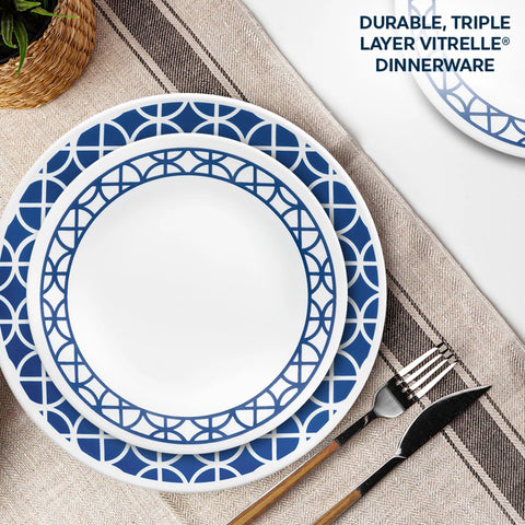 A bold pattern of circles and intersecting lines in cobalt blue give this dinnerware set a refined look. Casual enough for everyday use, it dresses-up perfectly for dinner with friends. Pair it with white or cobalt accessories for a polished presentation, in the dining room or on the patio.