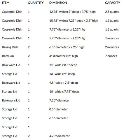 | Casserole Dish | 1 | 10.75'' wide x 7.25'' deep x 3.5'' high | 1.5 quarts |