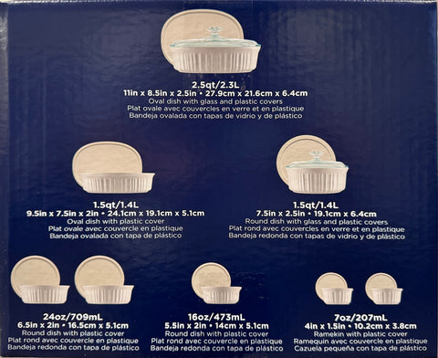 - Set includes: 2 oval dishes (1 with glass lid; 2 with plastic lid); 2 round dishes (1 with glass lid; 2 with plastic lid); 2 ramekins with lids; 2 large round dishes with plastic lids.