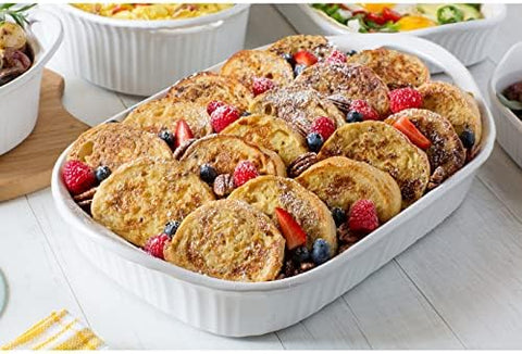 Form and function go together in our 3-qt oblong stoneware casserole, a classic for its understated style and kitchen-to-table versatility. Fluted sides extend up and out to create integrated handles. Ready for the microwave, oven, fridge, freezer, and dishwasher, too.