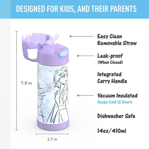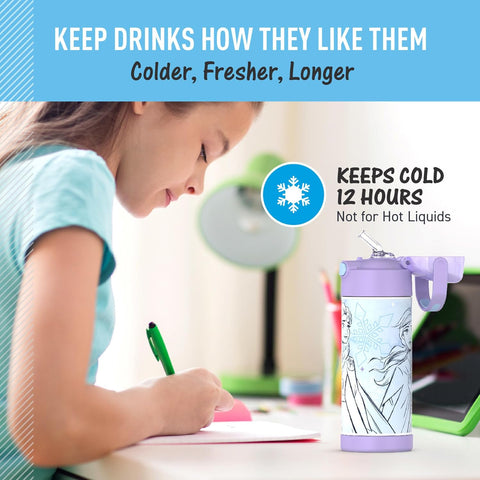 - STAYS COLD: THERMOS vacuum insulation technology keeps drinks cold for up to 12 hours. Our kids water bottles are built so their drinks are as cool on the inside as they look on the outside. Not for hot liquids
