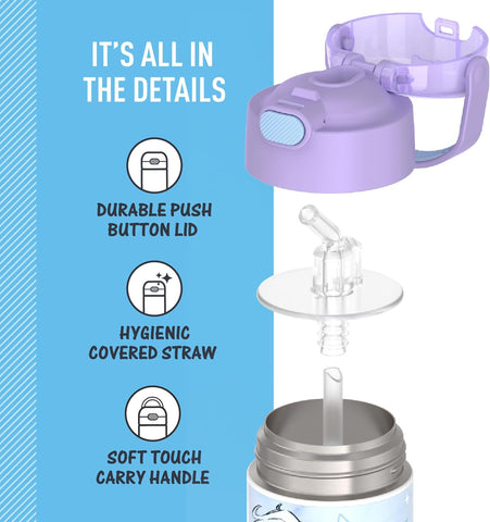Kids love FUNtainer® products from Thermos® brand, but parents love them even more. The FUNtainer 14oz Vacuum Insulated Stainless Steel Water Bottle with a silicone straw keeps drinks cold for up to 12 hours. FUNtainer products are always made with love from BPA-free materials. The double wall stainless steel construction is built to handle drops, dings and assorted roughhousing. The 14oz bottle includes an integrated carry handle with soft-touch grip, making it easy for kids to carry with them throughout the day. The handle can also be folded down when not in use. Keep germs away with the hygienically covered straw which is removable for easy cleaning. To clean, you can pop your FUNtainer water bottle in the dishwasher; however washing by hand is recommended. Not for use with hot liquids.