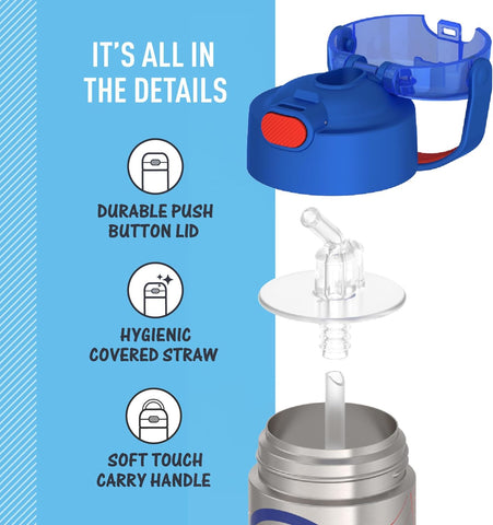 Kids love FUNtainer® products from Thermos® brand, but parents love them even more. The FUNtainer 14oz Vacuum Insulated Stainless Steel Water Bottle with a silicone straw keeps drinks cold for up to 12 hours. FUNtainer products are always made with love from BPA-free materials. The double wall stainless steel construction is built to handle drops, dings and assorted roughhousing. The 14oz bottle includes an integrated carry handle with soft-touch grip, making it easy for kids to carry with them throughout the day. The handle can also be folded down when not in use. Keep germs away with the hygienically covered straw which is removable for easy cleaning. To clean, you can pop your FUNtainer water bottle in the dishwasher; however washing by hand is recommended. Not for use with hot liquids.